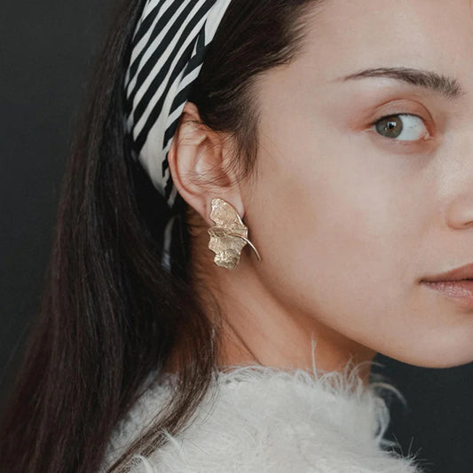 18k gold trendy personality C-shaped earrings with hammered flower high-end design